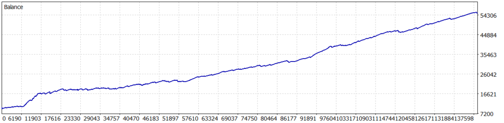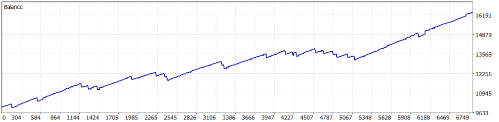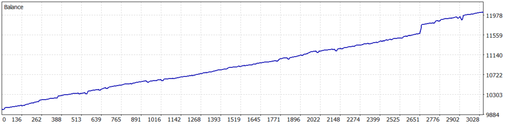 La curva de equidad adjunta muestra el resultado de una optimización con un número muy elevado de ejecuciones de prueba. Aunque se integraron stop losses ajustados y la estrategia de negociación funciona sin martingalas, la curva es irregular. Esta irregularidad se debe a varios factores, como la volatilidad del mercado y la frecuencia de las decisiones de negociación.