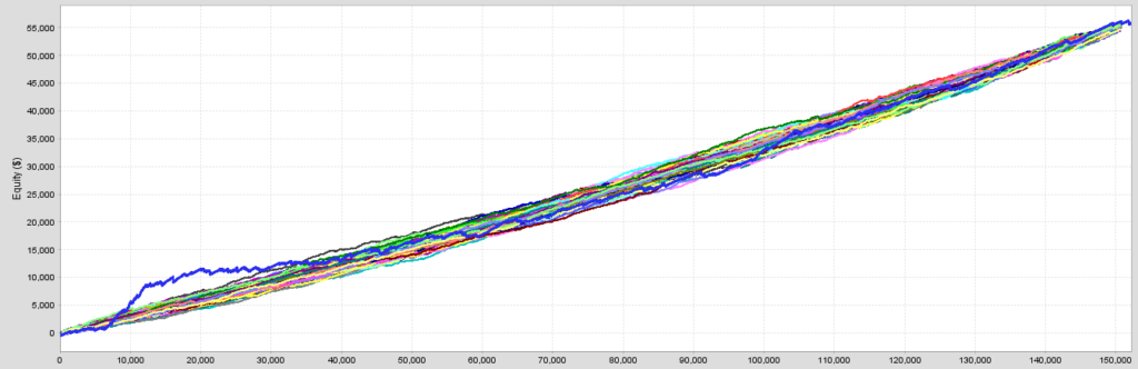 El resultado de esta diversificación son 40 curvas de equidad diferentes que reflejan una estrategia de negociación única para cada par de divisas. Cada una de estas curvas de renta variable muestra el resultado de una optimización con un gran número de ejecuciones de prueba y ofrece una visión global del rendimiento de cada estrategia individual.