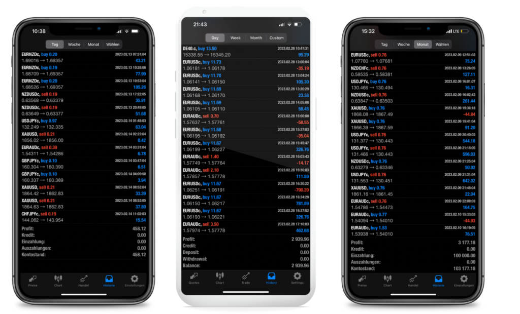 Nuestro algoritmo de negociación se basa en una estrategia de inversión diversificada basada en 40 pares de divisas diferentes (aquí mostramos 3 a modo de ejemplo). En cada par, se desarrolla una estrategia de negociación individual mediante procedimientos de optimización para garantizar un riesgo muy bajo para nuestros clientes.