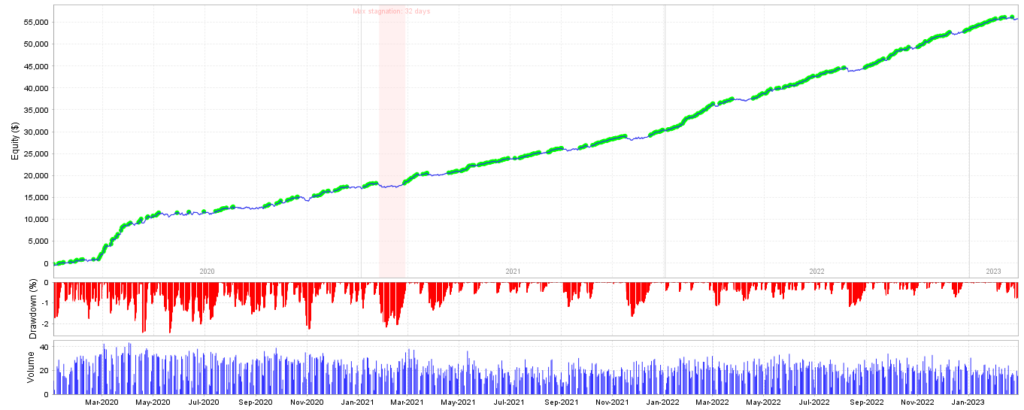 Aquí puede ver la curva de equidad, que resume los 40 pares de divisas y, por tanto, ofrece una imagen general del rendimiento de nuestro algoritmo. Esta curva de equidad es el resultado de una cuidadosa simulación en la que nos aseguramos de que las estrategias de negociación individuales no se correlacionan y no tienen un drawdown demasiado alto juntas.